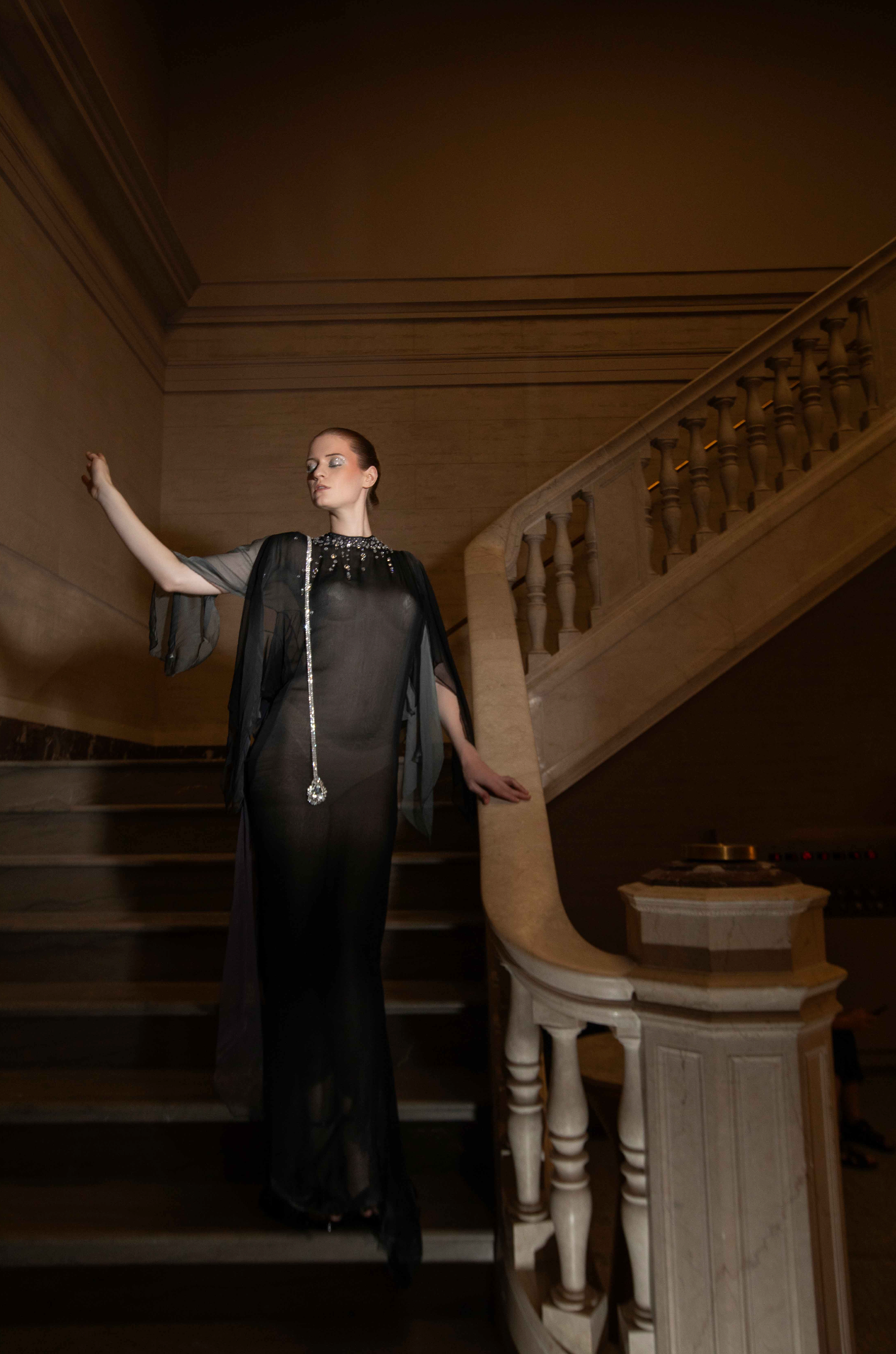 Embrace effortless elegance with the Crystal Nouveau, a striking statement piece for luxurious escapes. Crafted from black crinkled chiffon, this...