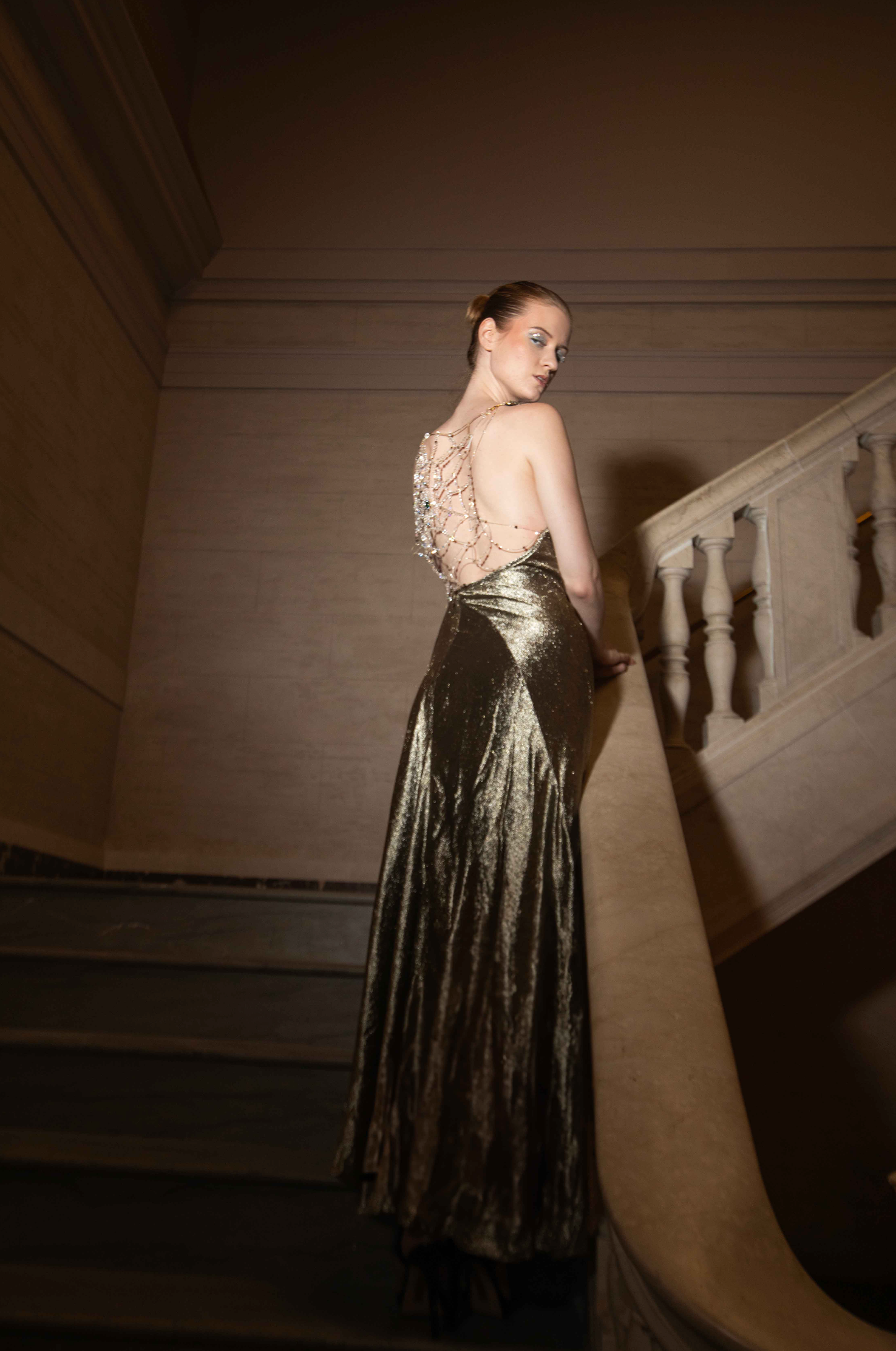 Step into timeless glamour with Gatsby’s Web, a silk lamé masterpiece that exudes elegance and intrigue. This shimmering gold dress...